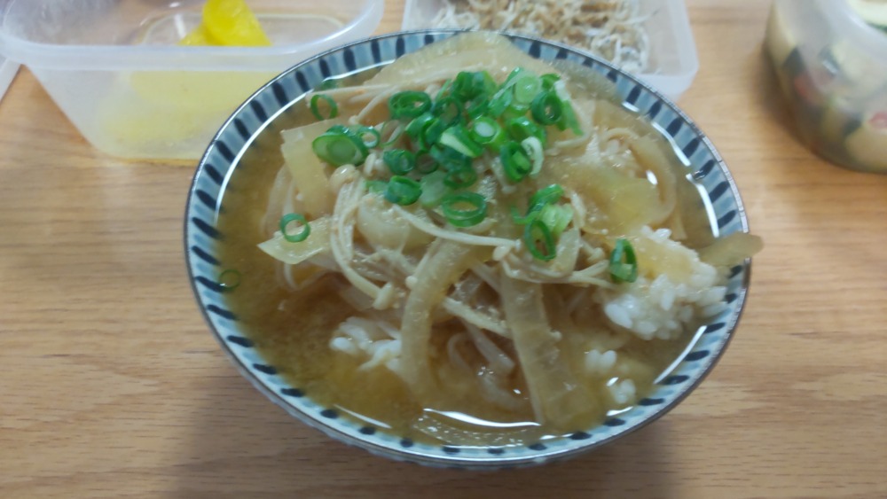 えのきと玉ねぎの旨味たっぷりの味噌汁に、青ねぎを散らせば完成。