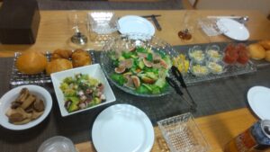 イチジクと生ハムのサラダ、タコとアボカドのマリネ、小鉢に分けたサラダや冷たいトマトスープ…。