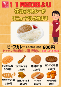 🍛 明日11月20日より、カレーがリニューアルします 2025年11月19日 スタッフブログ 今まで 700円だったカツカレー・エビフライカレーは、トッピング制導入により900円前後になります。 材料費の高騰が続き、700円では維持が難しくなったためです。どうかご理解いただければ幸いです。 基本の ビーフカレーは600円。ここにトンカツ・エビフライ・唐揚げ・ハンバーグなど、お好きなトッピングを自由に追加できます。 「今日は軽く」「今日はガッツリ」気分に合わせてカスタムできるようになりました。 これからも変わらず、手作りの味を大切にしてまいります。